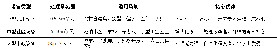 生活污水处理设备并非 “一刀切” 的产品,需根据处理规模、水质特点、安装环境等因素选择适配类型。目前市场上主流设备可按 “处理规模” 和 “安装方式” 分为两大类别,其适用场景与核心优势差异显著: