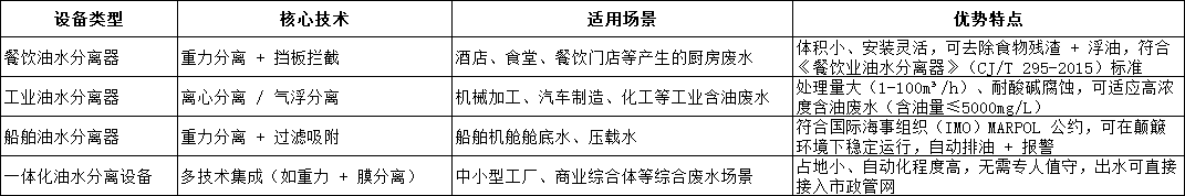 不同类型的油水分离设备,其分离逻辑均基于 “油与水的物理特性差异”,但技术路径存在明显区别,需根据实际工况选择适配方案。