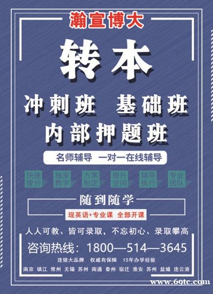 江苏瀚宣大专转本是一家专做五年制专转本培训的辅导机构已有十五年,汇集了众多转本经验丰富的名师,班化教学,帮助同学们提高复习效率,找到复习方向。目前江苏省内13个城市的的1-5年级高职生均可以参加。并根据考生不同基础情况开设:周末班、暑假集训营、寒假集训营、考前班、冲刺班等不同班次,考生可根据自身基础情况选择相应的班次,不同的班次都有专业的老师进行指导,还针对考生的个人不同基础情况指导专业的复习方式。更多江苏五年制专转本详情请联系1800微514同3645严老师,预约试听课程并领取招生简章一份。