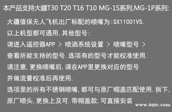 扇形喷嘴是目前植保wu人机使用广泛的喷嘴,代表是XR11001VS,大疆农业植保机使用的喷嘴即为该型号,它的压力范围是1-4公斤,在压力较低时也能产生良好的喷雾效果。雾滴尺寸:细。材质为不锈钢。适合喷洒易溶于水的药剂,如乳油,微乳剂或者水分散颗粒剂等,可用在玉米,小麦,水稻等大田作物的喷雾。 空心锥形喷嘴 空心锥喷嘴:TX-VK系列,优点是不容易堵塞,陶瓷材质,使用寿命长。适合可湿性粉剂和叶面肥的喷雾。雾滴尺寸为细。