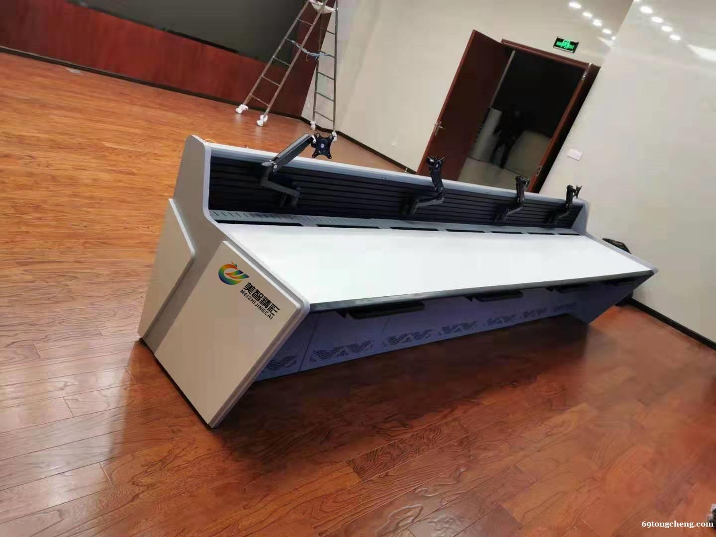 控制台后背墙采用挤压铝型材,表面阳极氧化处理,整体高度为156mm,控制台的后背墙固定在与主体框架为一体的折弯成型固定架上,其悬挂显示器支臂的凹槽板截面厚度为1.5mm,承接支撑柱连接配件采用多折反边加加筋做法,厚度为3mm;安装完毕后连成一体。