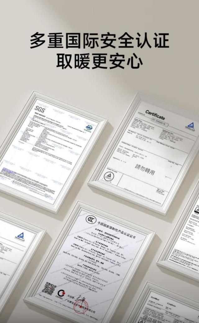 该款取暖器荣获GS(德国安全认证)、UL(美国安全认证)、SGS(瑞士检测认证)、CE(欧盟安全认证)、CCC(中国强制认证)等全球七大洲权威认证,从材质筛选、生产加工到成品检测,每一个环节都遵循严苛标准,确保质量稳定可靠,使用寿命长久,无需频繁维修更换,既减少餐厅的运营麻烦,也省去豪宅家庭的维护烦恼。这些认证覆盖了防电击、防火、热量安全等七大核心安全维度,全方位守护使用安全。