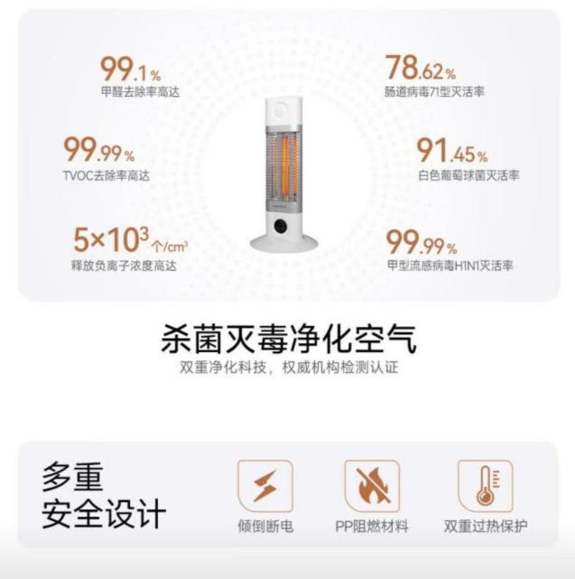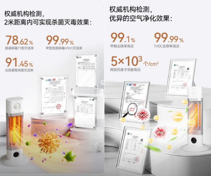 不同于传统取暖器“烤空气”的低效模式,伟而特全频谱红外透射加热数秒速热,热能转换98%——它发射的特定波长红外线,能直接穿透空气作用于人体细胞,引发共振产热,无需预热,开机5分钟就能感受到由内而外的温暖,没有风机噪音,也不会导致空气干燥,彻底告别“头热脚冷”和皮肤紧绷的困扰。更关键的 是,它不止能取暖,杀菌、除甲醛、除湿、净化空气四大功能集于一身,四季都能用,实用性拉满。