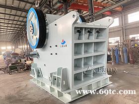 作为一款工业破碎及制砂生产线中常用的一款粗破机械,该颚式破碎机运转工作时,主要是以电动机为动力,由三角皮带和槽轮驱动偏心轴,使动颚按预定轨迹作往复运动,从而将进入由固定颚板、活动颚板和边护板组成的破碎腔内物料予以破碎,并通过下部的排料口将成品物料排出。