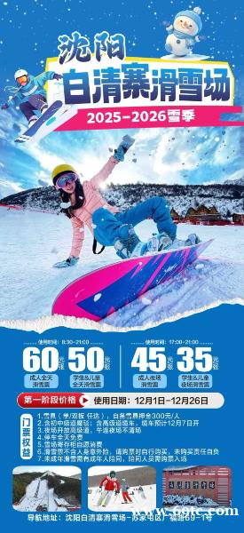 想换个雪场解锁新体验?**柠檬旅行社带你冲沈阳白清寨滑雪场2025-2026雪季**!第一阶段12.1-12.26特惠票已开抢,60元起就能滑全天,性价比直接拉满~ ## 联系我时,请说是在六九同城看到的,谢谢!