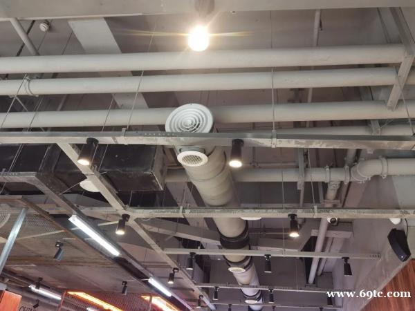 通风原有一送一回,爆炒过程中产生的油烟较大。另外,商场是密闭的,通风性较差,在通风上也做了改造,增加了通风口,避免集中送回风效果差,通风效果好,舒适系统佳!